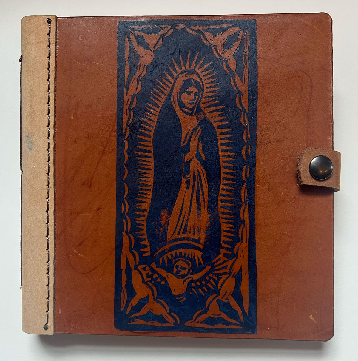 Vegetable Tanned Leather sketchbook with linoleum relief print. Machine and hand stitching with white hot press paper and topographic map paper signatures secured closed by a snap. Vegetable tanned leather will darken with age, sun exposure and skin oils. Natural flaws are embraced.